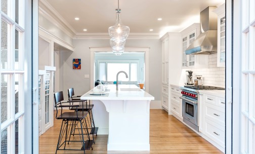 Today’s casual lifestyles mean that architects and homeowners are getting more creative, coming up with new ways to transform their living spaces to create more livable spaces. In this renovation, the open concept and more casual dining experience were achieved by swapping the large dining room and the smaller kitchen. The now-larger kitchen opens up to the living room at one end, and features beautiful French doors to the backyard at the other. The smaller dining space provides a more casual dining experience without sacrificing the functionality of a formal dining room for larger family gatherings.